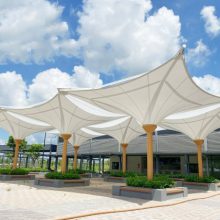 Tính năng vượt nhịp lớn giúp giải phóng toàn bộ không gian sân và khả năng tạo hình đa dạng là ưu điểm nổi bật khi sử dụng các loại vật liệu màn căng dự ứng lực PVDF vào các công trình mái che sân thể thao.