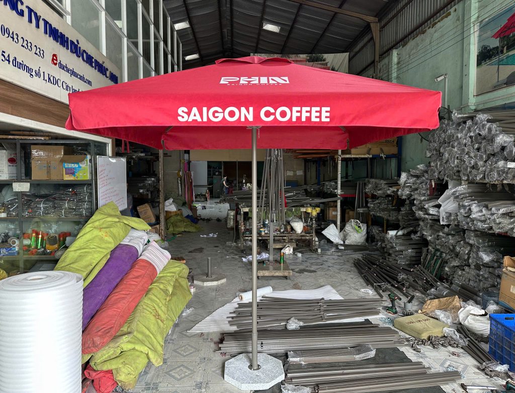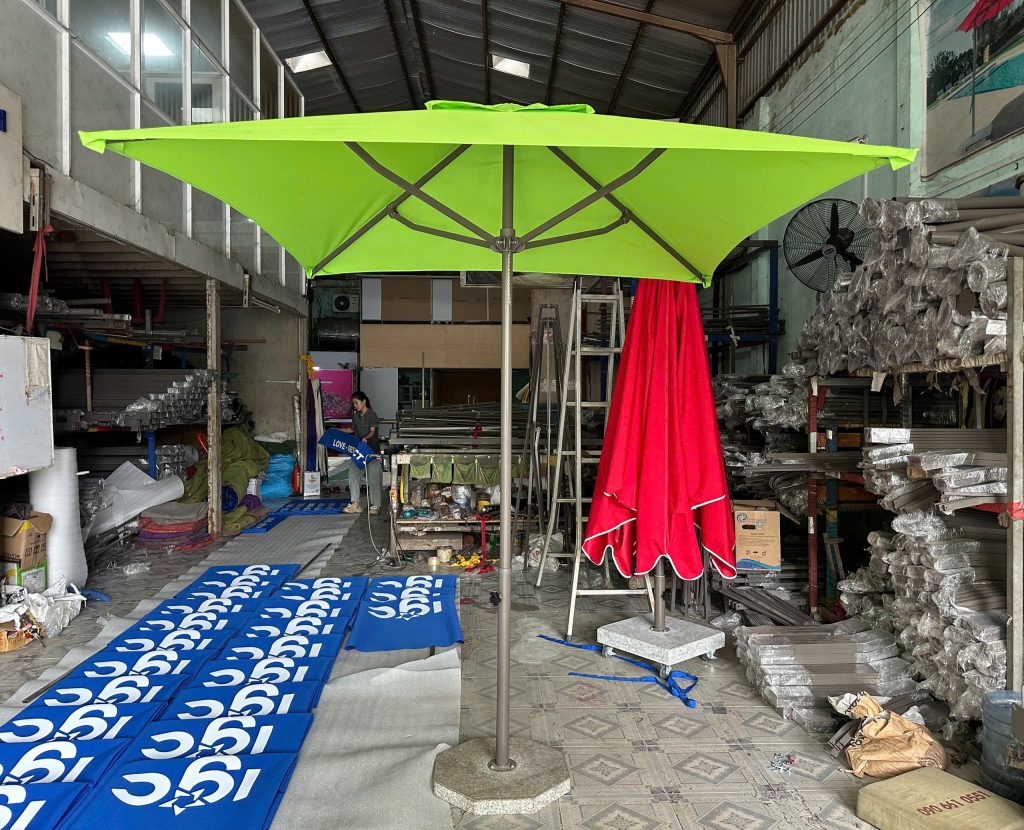 Dáng vuông mang lại cảm giác trẻ trung, năng động và dễ dàng ghép sát nhiều cây dù lại với nhau để tạo thành một mái che lớn mà không bị hở khe như dù tròn, in ấn logo và tên thương hiệu nổi bật.