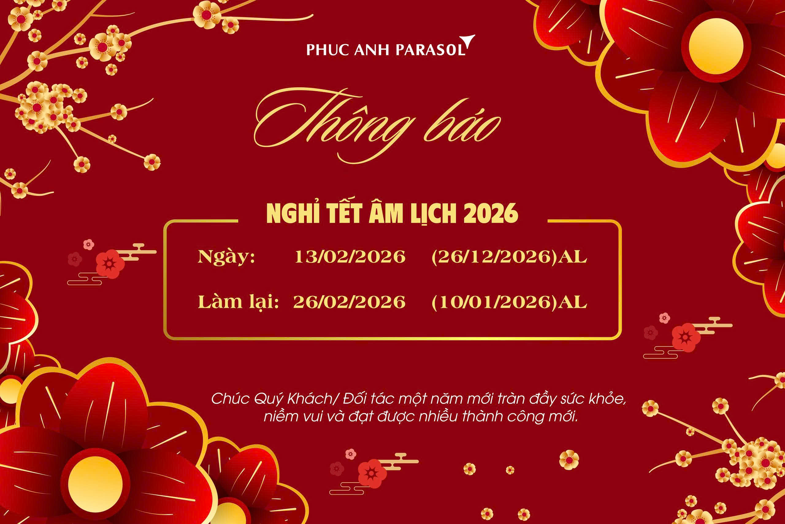 Công Ty TNHH Dù Che Phúc Anh xin trân trọng thông báo đến Quý Khách hàng và Quý Đối tác lịch nghỉ Tết Nguyên đán Bính Ngọ 2026.
